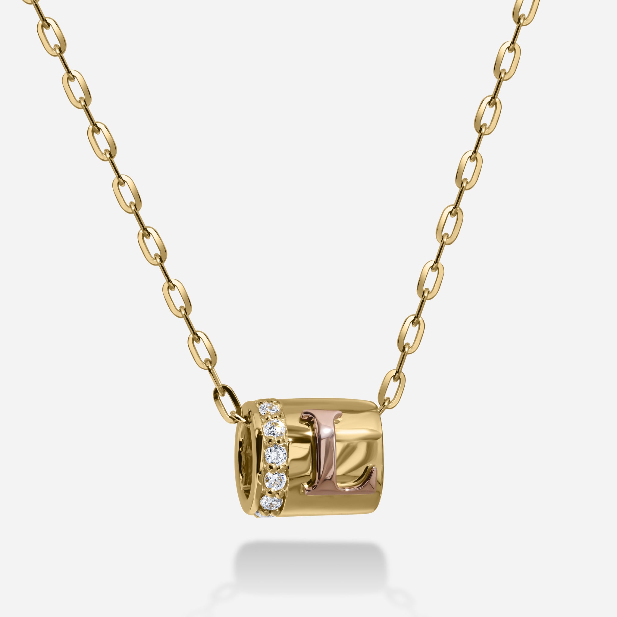 A round charm crafted with your favorite letter, combining two gold colors. Wear as a necklace or a bracelet, with or our without diamonds.